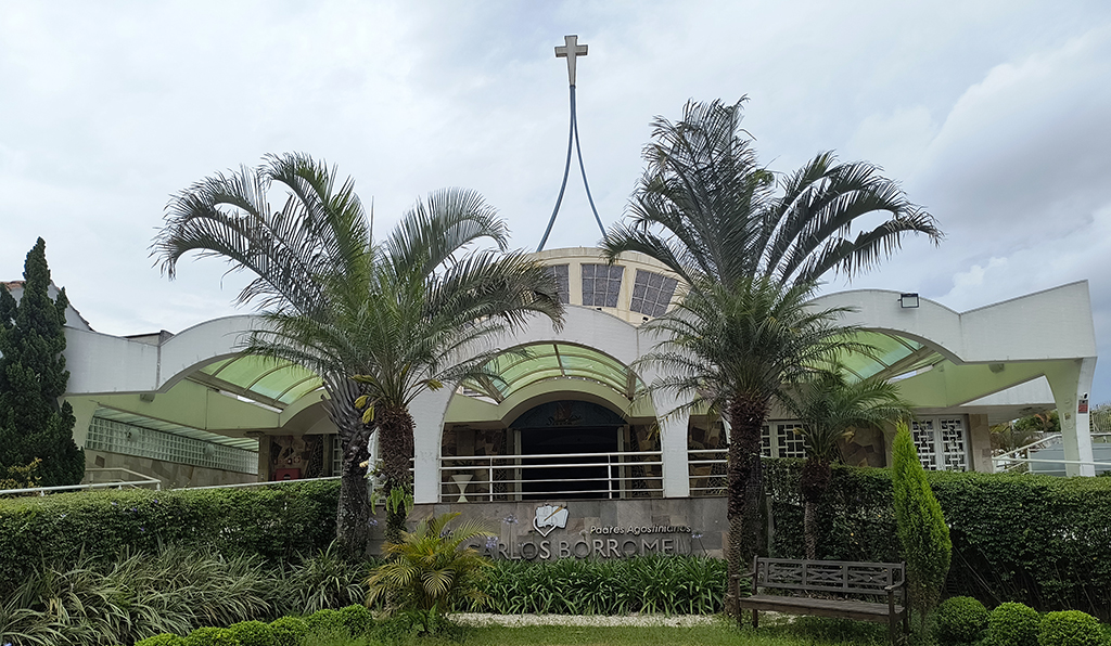 Olhando para a entrada da igreja, para o duplo arco da frente, predominam os alegres tons laranja, com a imagem do Padroeiro, São Carlos Borromeu.