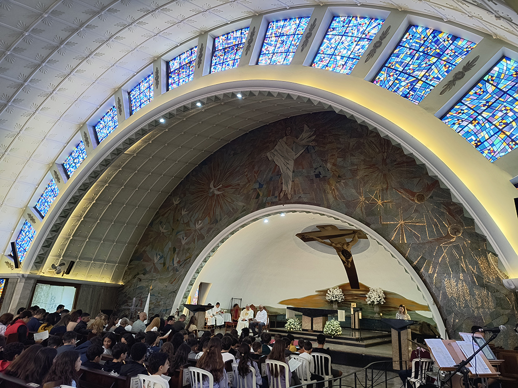 O mosaico, que antecede o altar, é centralizado com a imagem do Cristo Ressuscitado. Os tons claros e leves reflexos dourados, proporcionam um clima de paz e tranquilidade, tão propício para o recolhimento e a oração.